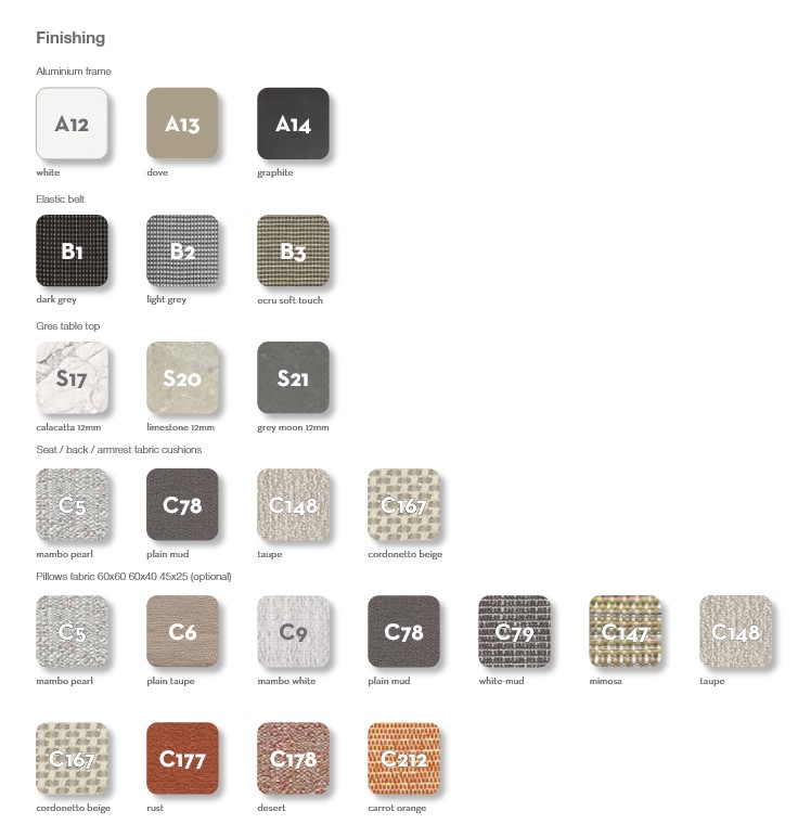 Disponibile nelle colorazioni ANTRACITE , BIANCO e TORTORA con cuscineria abbinata.