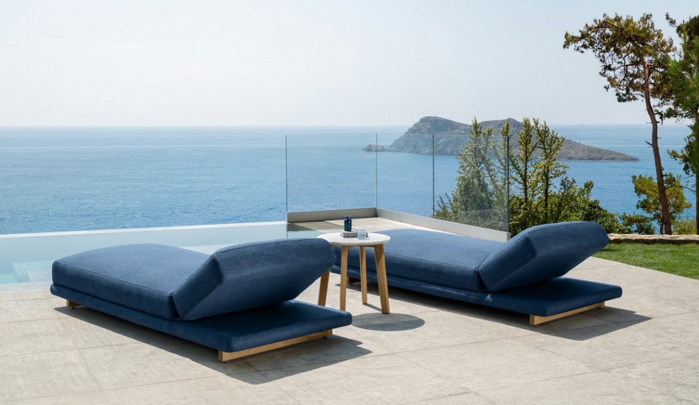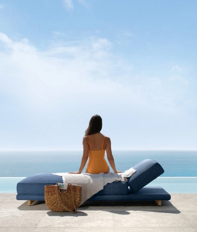 La struttura, rivestita anch’essa di tessuto, sembra essere sospesa da terra grazie agli essenziali e lineari piedi di appoggio realizzati nel resistentissimo legno Accoya. I rivestimenti sfoderabili e prodotti con filati resistenti agli agenti atmosferici rendono questo complemento la scelta più adatta per il relax all’aperto.