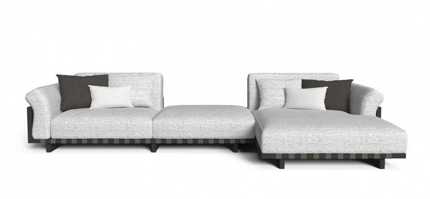 Cuscini sfoderabili realizzati in quick foam, tessuti di qualità attentamente selezionati e resistenti alle intemperie permettono al divano modulare di adattarsi a molteplici location all’aperto.