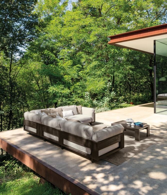 Il tema della scatola di legno a cui si ispira l’intera collezione rimane intatto in ogni composizione realizzata, grazie all’applicazione dell’innovativo legno Accoya nella struttura che avvolge la seduta comoda e abbondante.