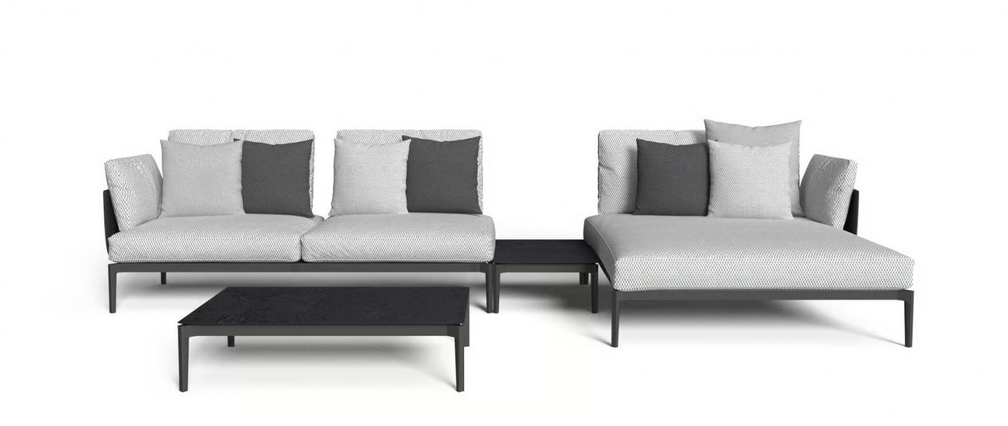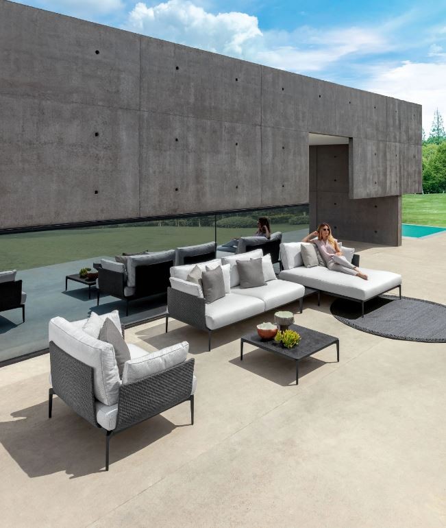 Le molteplici combinazioni del divano modulare Leaf lo rendono ideale per arredare gli spazi esterni.