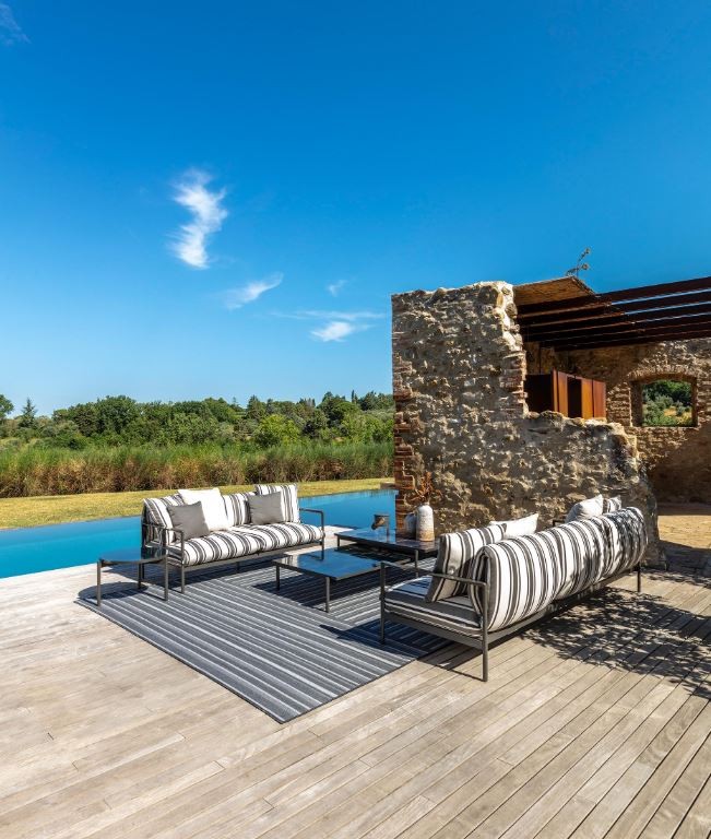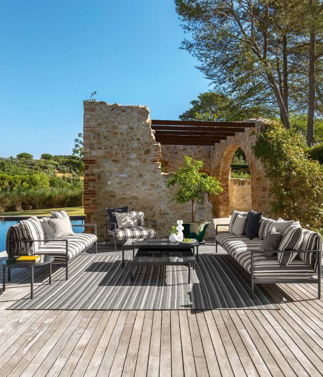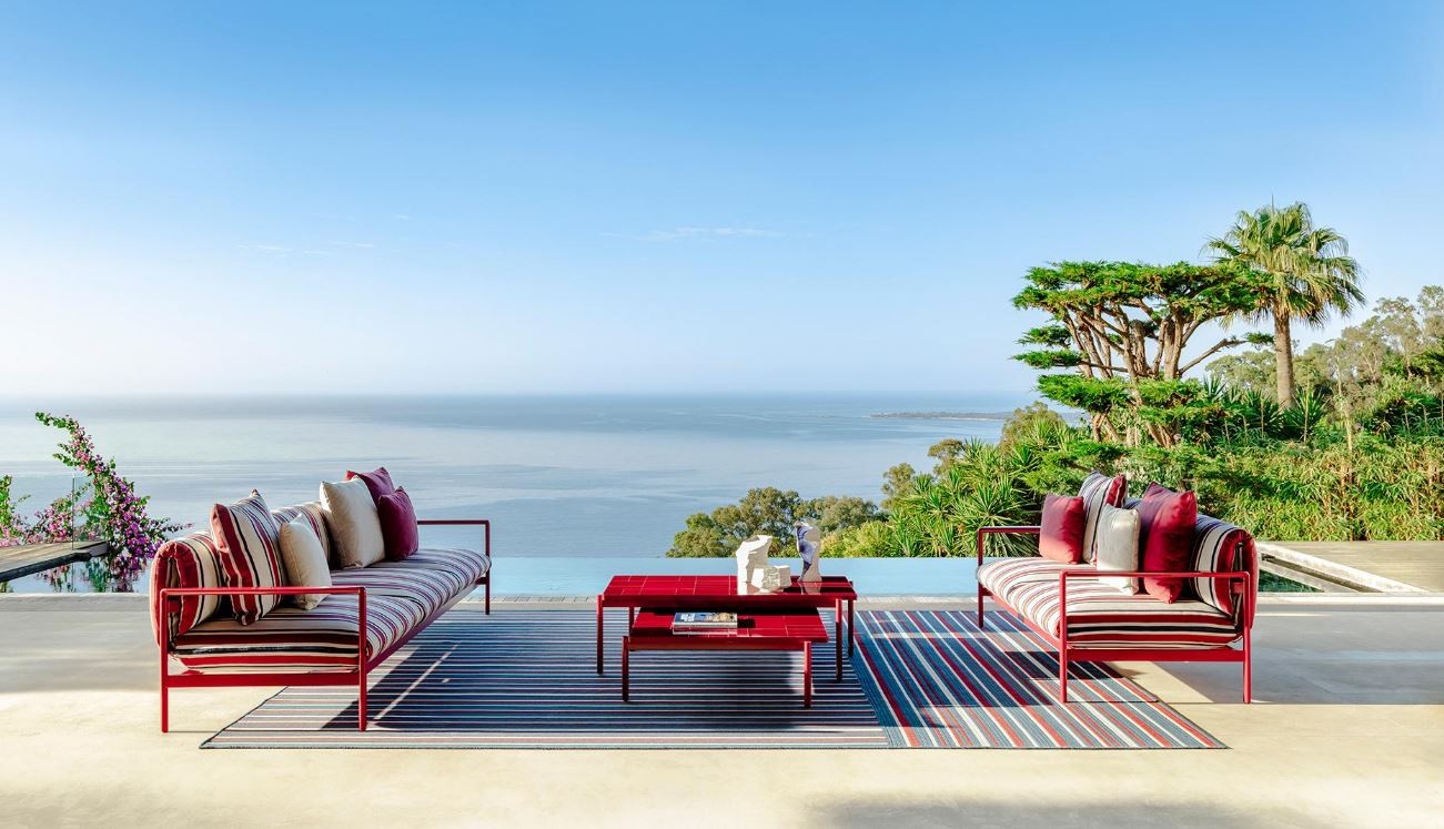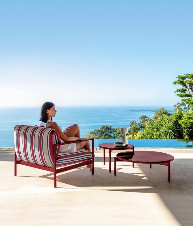 L’idea di una “nouvelle vague” di Ludovica Serafini e Roberto Palomba, si esprime in tutta la sua originalità nei cuscini delle sedute che diventano schienali, abbracciando una struttura in alluminio semi lucido dallo stile retrò.