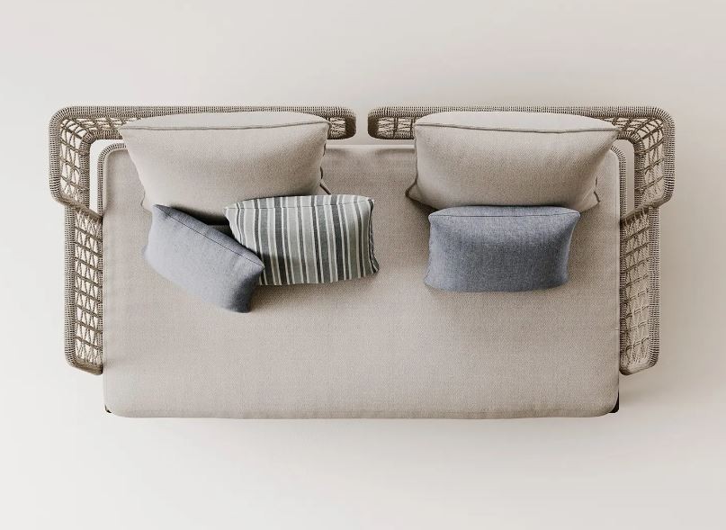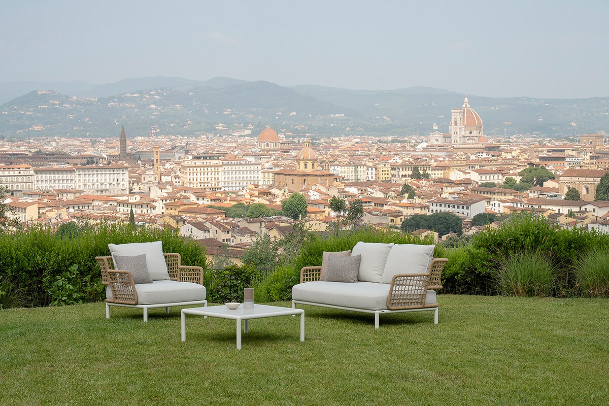 Partendo dall’anima del metallo, la base si veste di elementi in tubo di metallo disegnando un arredo leggero, lineare ma dalle proporzioni accoglienti; in questa versione vi è il rivestimento in wicker intrecciato, il cui motivo twist e colore naturale si ispirano alla autentica fibra di giacinto.
