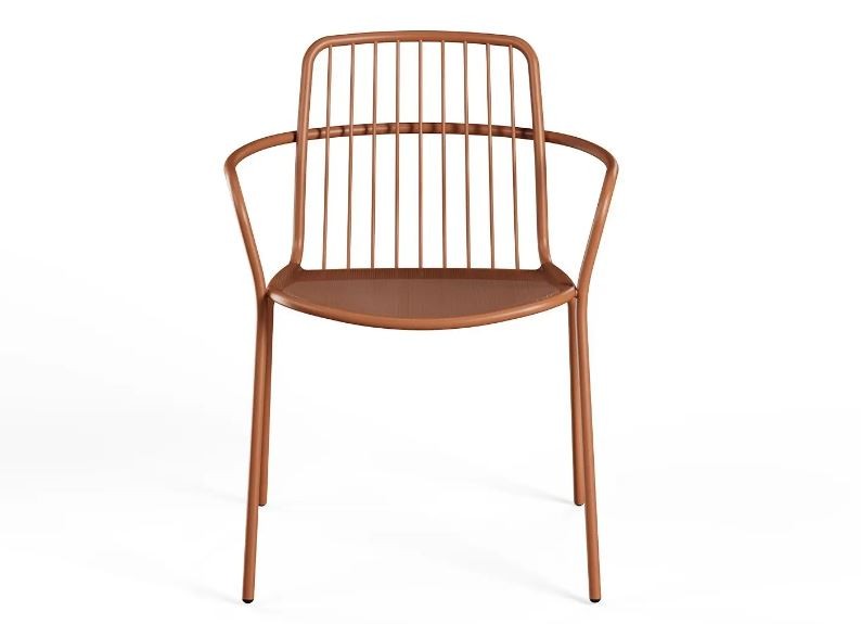 La struttura in metallo, caratterizzata da una trama ariosa e da linee regolari, richiama il movimento fluido del vento, da cui prende ispirazione. Il design fonde la solidità della lamiera stirata con la sinuosità dell’asta curvata, creando una seduta che trasmette libertà e spontaneità.