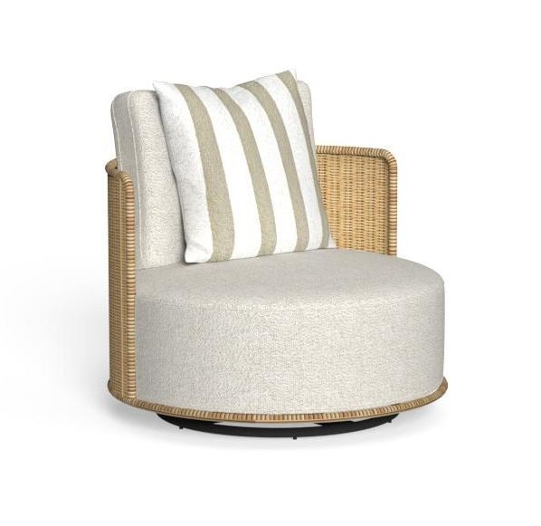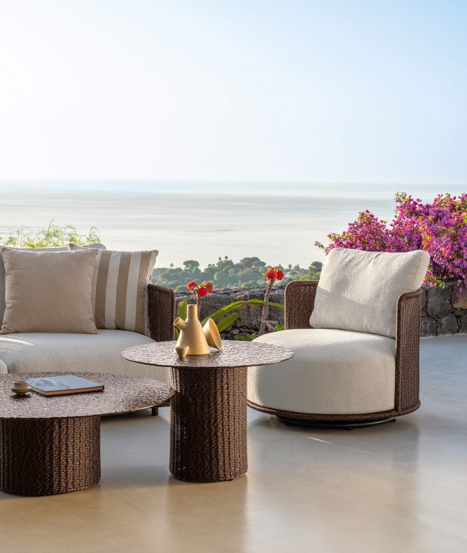 La seduta ampia e rotondeggiante, sostenuta da una base girevole, invita al relax e al dialogo, creando una relazione fluida con l’ambiente circostante. La struttura in alluminio rivestita in midollino intrecciato conferisce eleganza e solidità, mentre la cuscineria, soffice e generosa, enfatizza il senso di comfort. Oggetto dal fascino trasversale, unisce funzionalità e stile, diventando protagonista di ogni scenario outdoor.