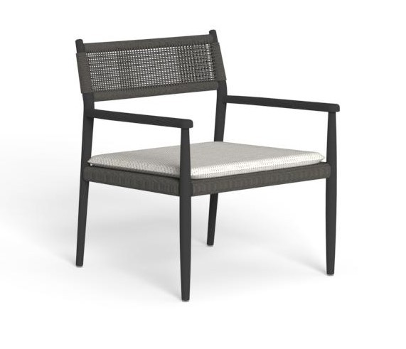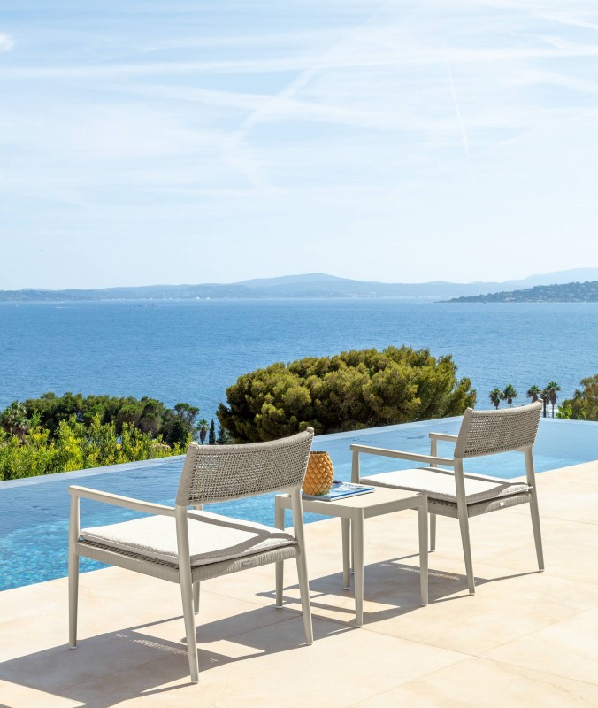 Tutti gli articoli sono caratterizzati da una struttura in alluminio verniciato a polvere disponibile in due diverse varianti di colore warm white e grafite, con schienali e braccioli in corda intrecciata Beige (R3) e Grigio scuro (R8).