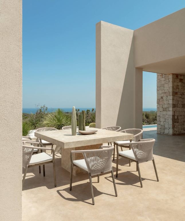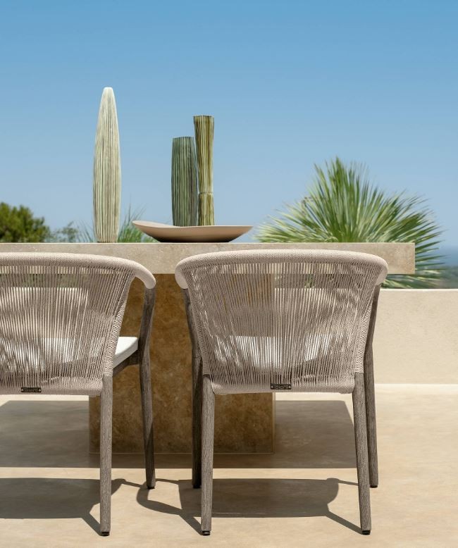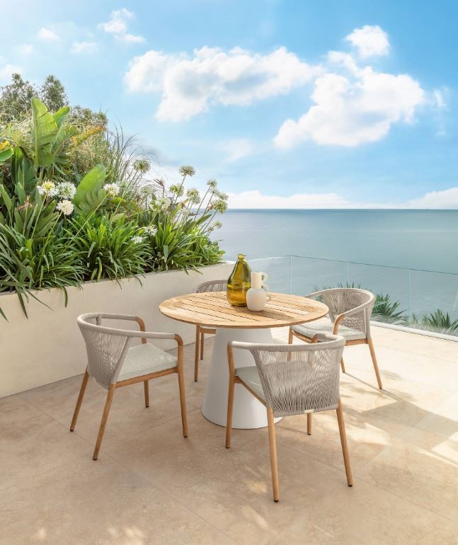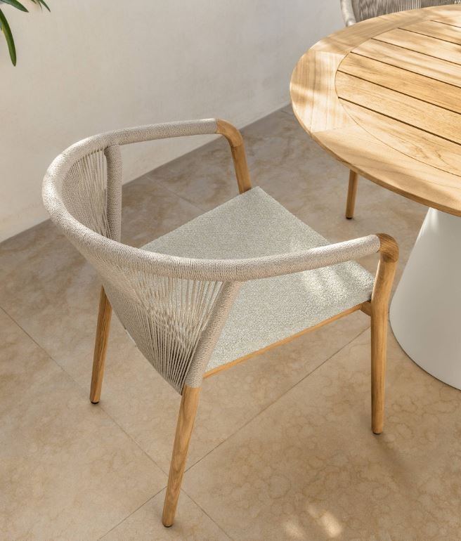 La struttura è in legno teak con due finiture: Natural Teak o Teak Silver-Grey, offrendo opzioni per adattarsi a diversi ambienti.