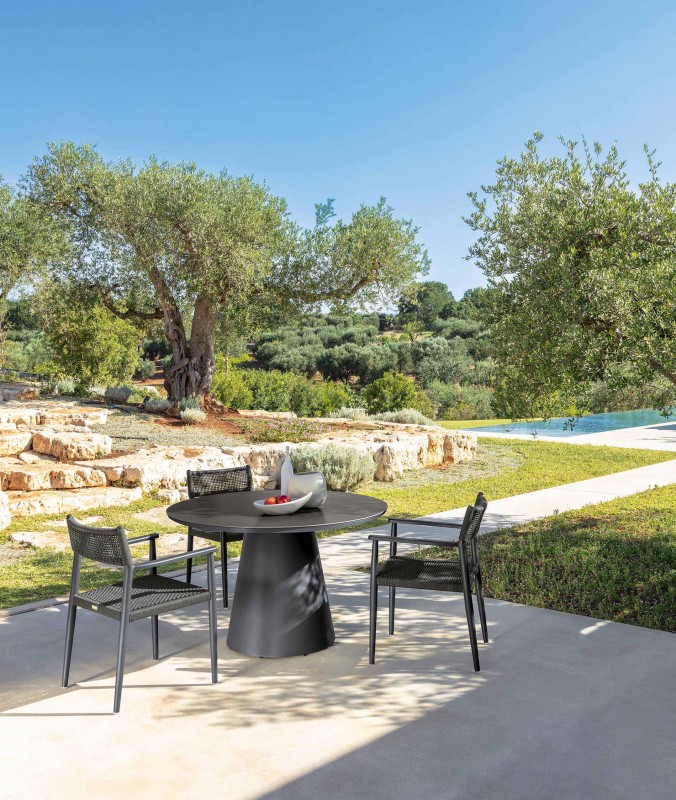 É caratterizzata da una struttura in alluminio verniciato a polvere disponibile in due diverse varianti di colore warm white e grafite, con schienali e seduta in corda intrecciata Beige (R3) e Grigio scuro (R8).