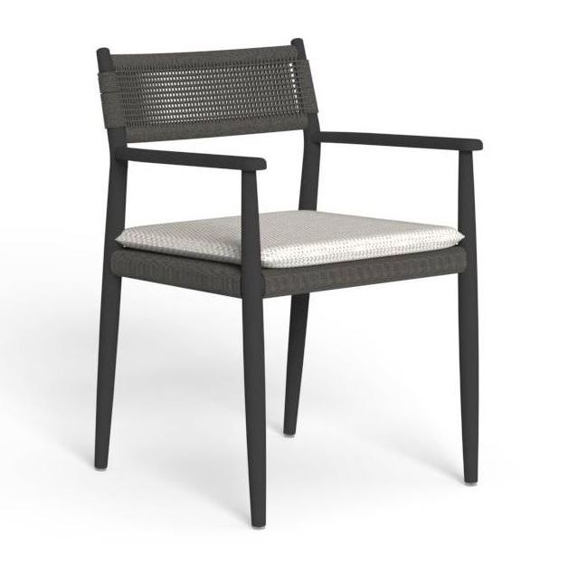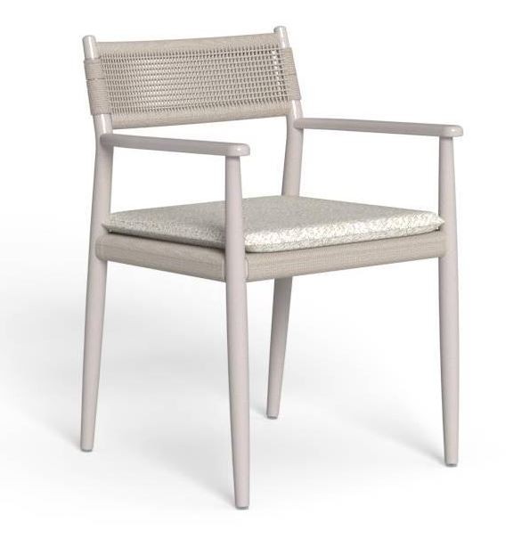 Il design è caratterizzato da linee pulite e un intreccio sullo schienale, che dona un tocco di leggerezza. I braccioli sottili aggiungono praticità, mentre il cuscino in tonalità neutre garantisce una seduta confortevole, ideale per cene all’aperto o momenti di relax.