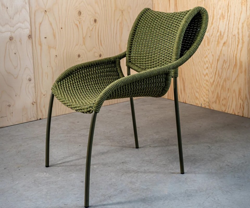 Robusta ma leggera grazie alla struttura in corda che sostiene la seduta, accompagna la persona a tavola o, perché no, per un aperitivo con gli amici.