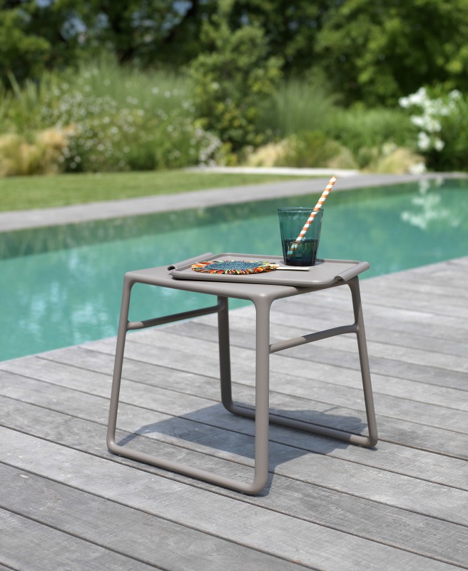 Tavolo basso POP in polipropilene fiberglass trattato anti-UV e colorato in massa. Finitura Matt. Impilabile.