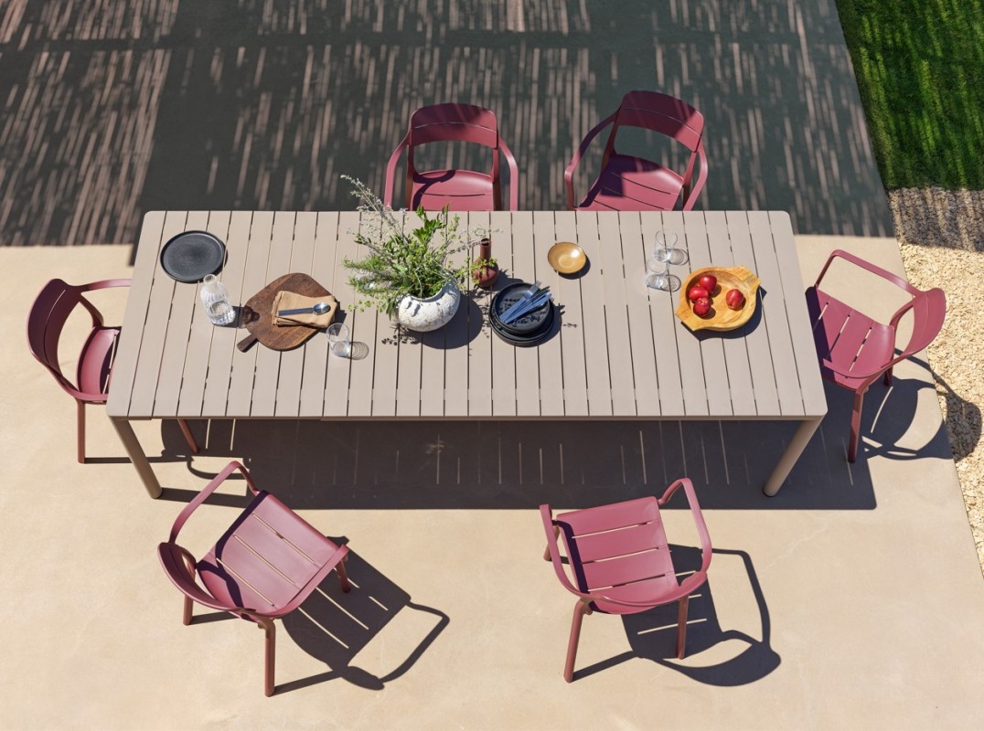 Tavolo TEVERE Allungabile: base in alluminio verniciato a polvere e piano dogato in polipropilene tinto in massa oppure rigenerato (solo nel colore TERRA).